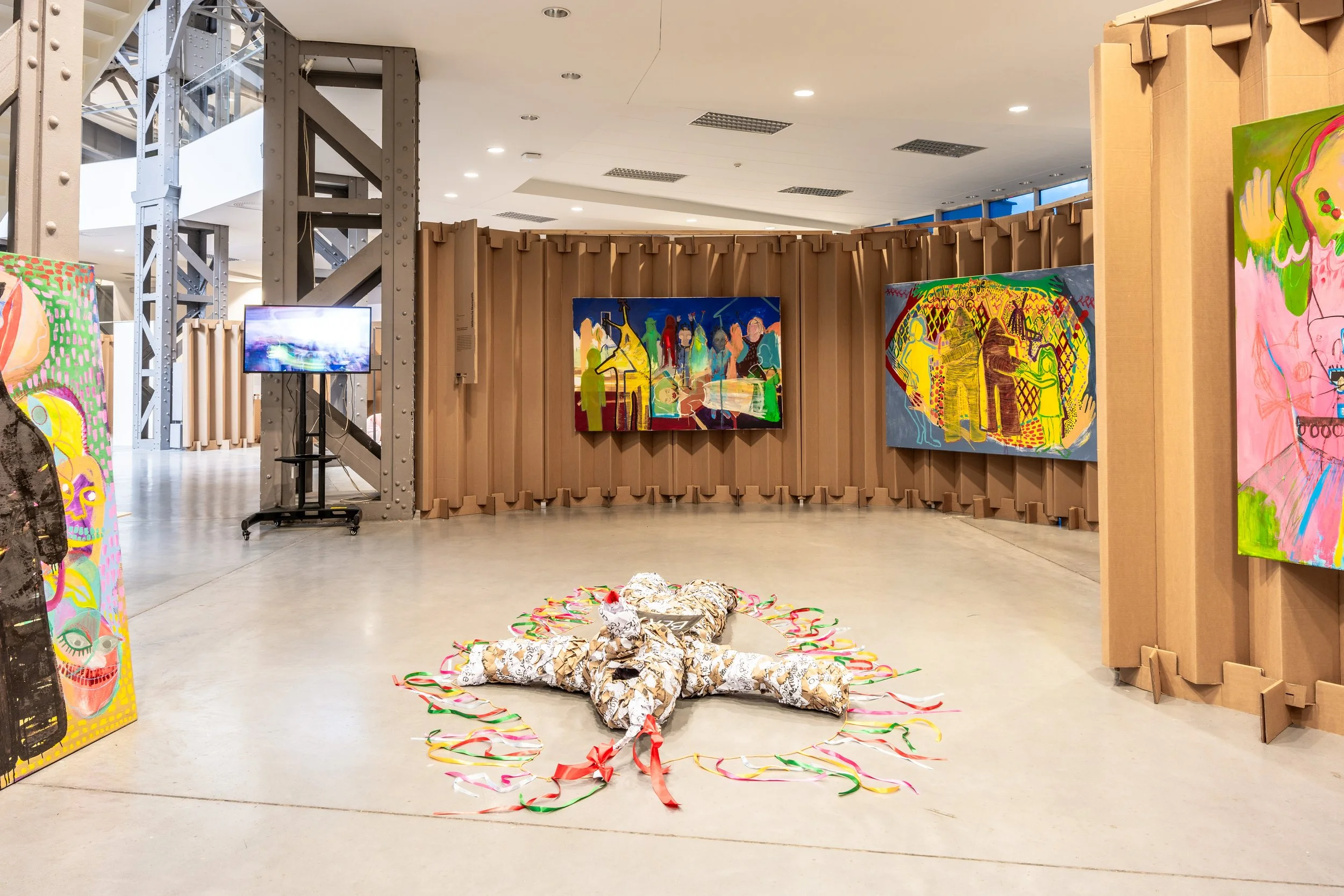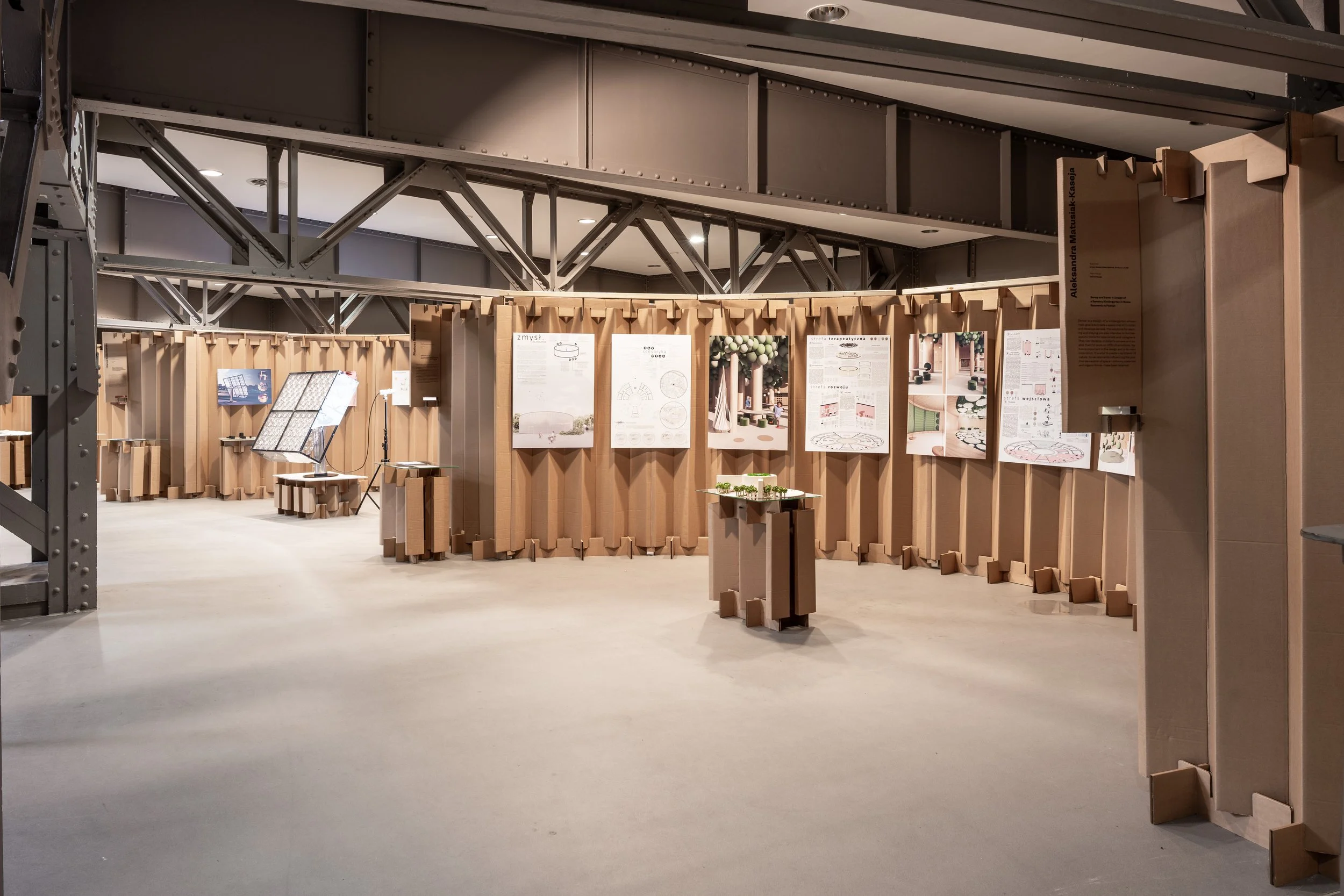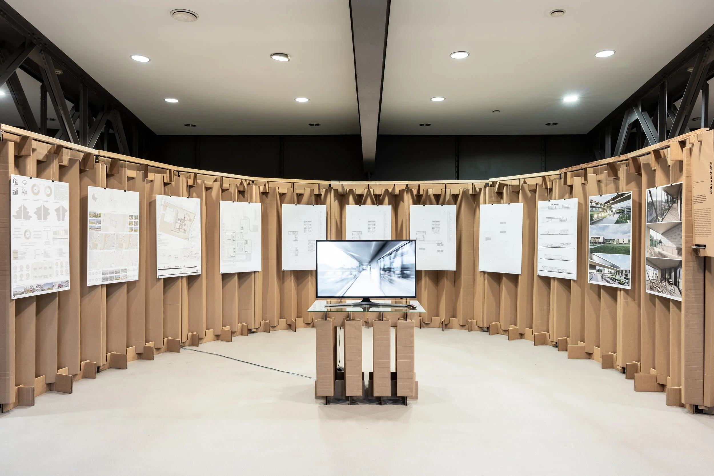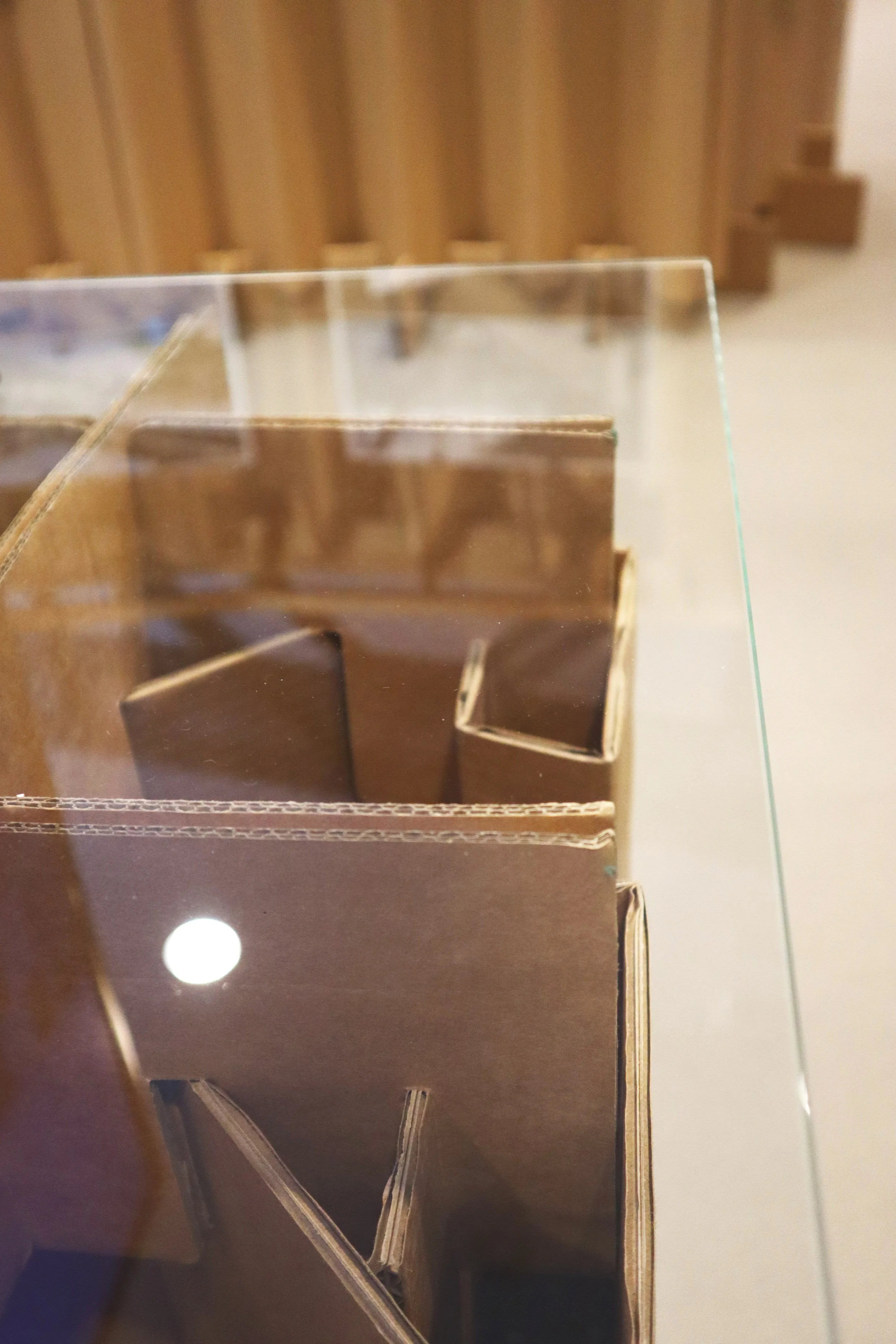 Do wykonania systemu użyłem tylko tektury, drewnianych kantówek jako punktów na zawiesia oraz szkła na blaty. Względem systemu z 2020 użyłem o 70% mniej tektury. Po wystawie, wszystkie ściany zostały złożone i przewiezione do ponownego użycia.