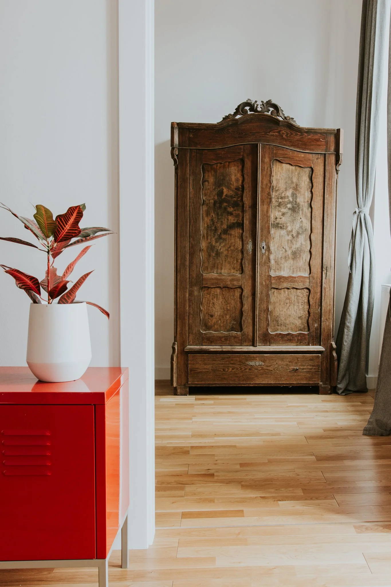 Na fotach widać starą szafę z drewna jabłoni i oryginalne krzesła Hałasa, których nawet nie trzeba było obijać na nowo. Podobne można dorwać na OLX albo sprzedajemypl za jakieś 200zł za sztukę tylko trzeba pogrzebać, polecam. Są dość łatwe do rozkręcenia i tapicerowania na nowo jeśli trzeba.