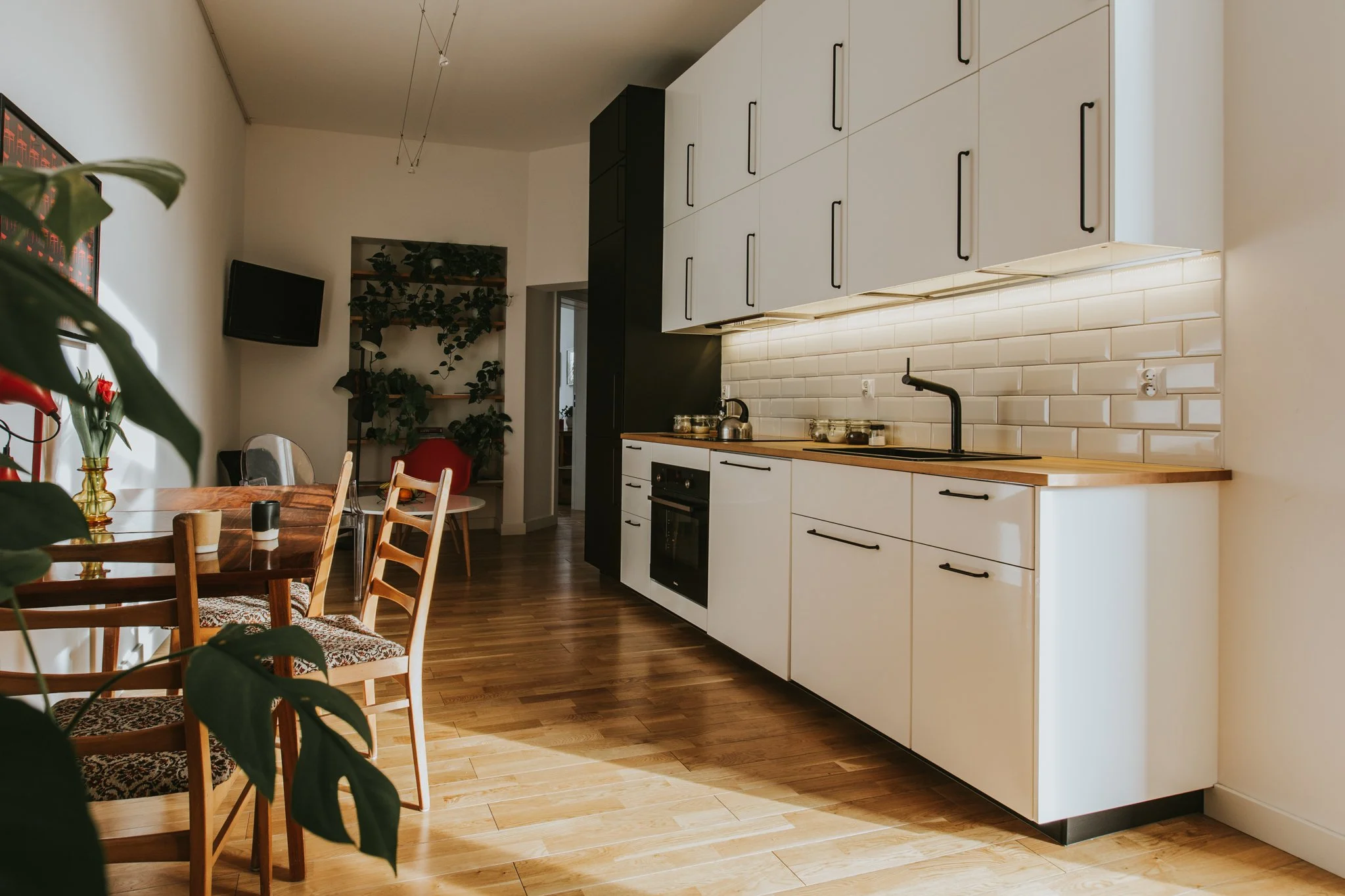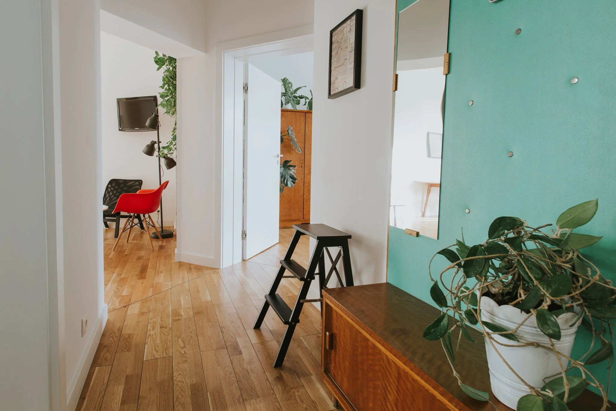 Lokal na 1 piętrze z potężnym tarasem projektowany w sumie jako mieszkanie dla dwóch par ze wspólną kuchnią i salono/jadalnią. Najlepiej wyszła sypialnia o trapezowym rzucie, do której prowadzą oryginalne drzwi. Kolor dziwnej ściany za łóżkiem zrobił się trochę sam przez nawarstwienie różnych farb i tynków nakładanych na nią przez lata - wystarczyło ją oczyścić i zakonserwować żeby tę historię zostawić na ścianie a nie na poduszce. Dobrą robotę zrobiły też duże rośliny i stare meble. To prosty i dobry ruch, żeby w nowym mieszkaniu zrobić fajny klimat i zasilić gotówką starszych ludzi - wtedy nie zbijamy cen!